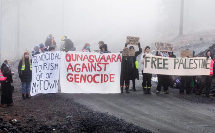 Rovaniemellä Golfkentäntiellä järjestettiin ennalta ilmoittamaton mielenosoitus 7.11.2026 aamulla. Yli 20 mielenosoittajaa tukki Golfkentäntien estäen liikenteen alueella olevalle hotellityömaalle.